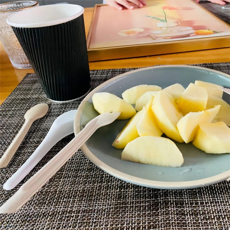 Our sugarcane bagasse pulp cutlery sets are made of non-wood plant fiber, available in various sizes and shapes are excellent for salad, desserts, and soup, which are sturdy, healthy, compostable and eco-friendly. It's waterproof and greaseproof, it can be used in hotels, restaurants, schools, cafes, and hospitals.